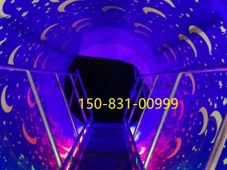 时空隧道,此设备是运用了科学知识的元素做出来的,外形是一个圆形的滚筒,筒内就精彩了,荧光喷绘的星星,月亮图案,让你仿佛置身于浩瀚的宇宙空间,十分震撼,这就是它的神奇所在。